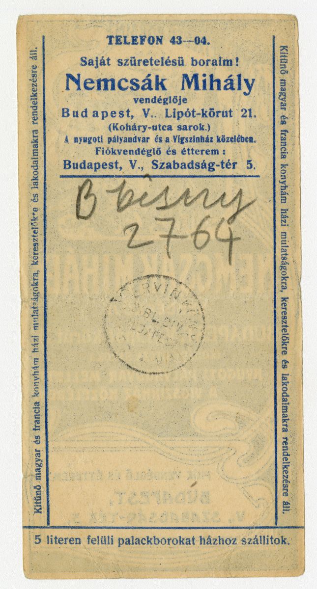 vendéglő, étterem, bor, reklámnyomtatvány, kisnyomtatvány, aprónyomtatvány, számolócédula