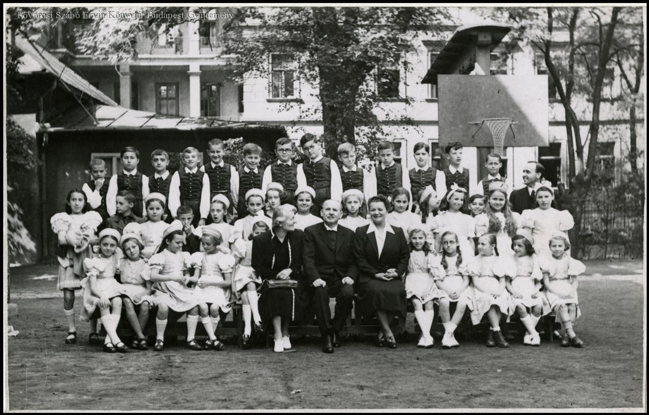 református egyház, általános iskola, egyházi iskola, udvar, csoportkép, pedagógus, tanuló, nyár, öltözködés, egyenruha, népviselet, népiesség, 1941