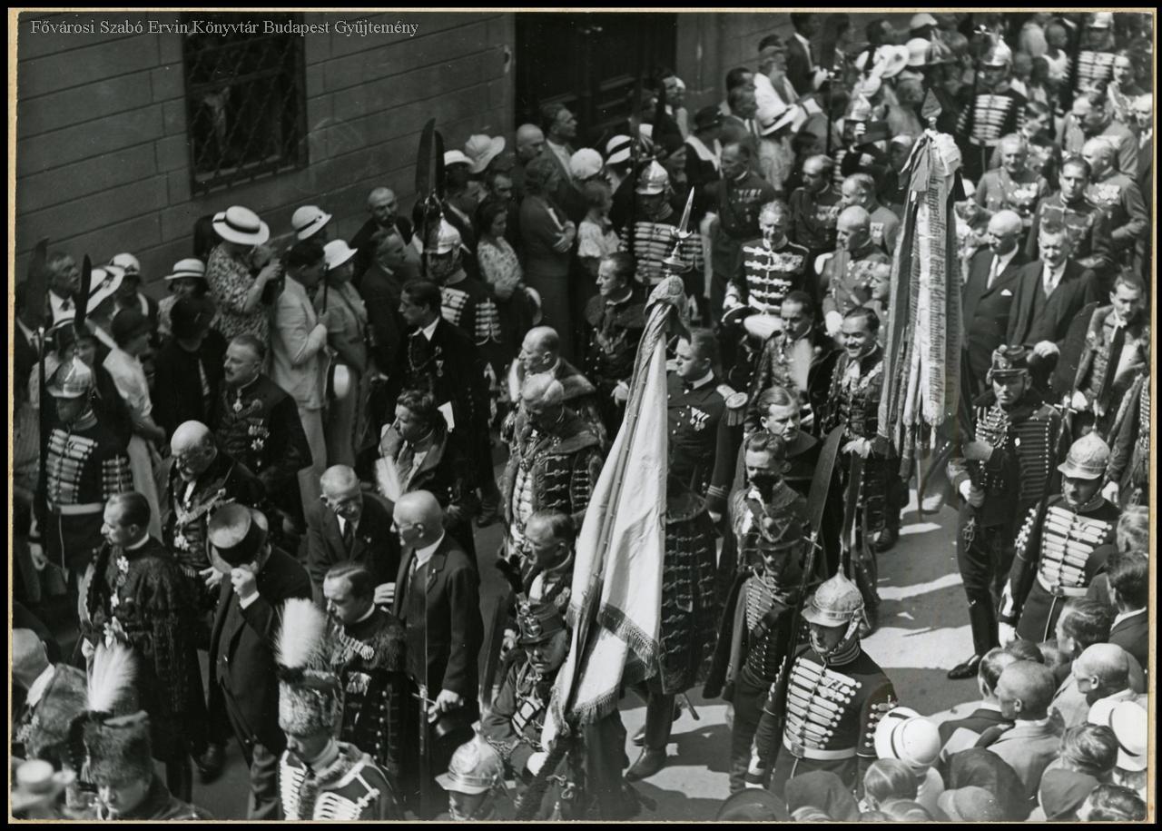katolikus egyház, körmenet, nemzeti ünnep, augusztus 20., arisztokrácia, néptömeg, nézők, zászló, testőr, 1934, Horthy-korszak
