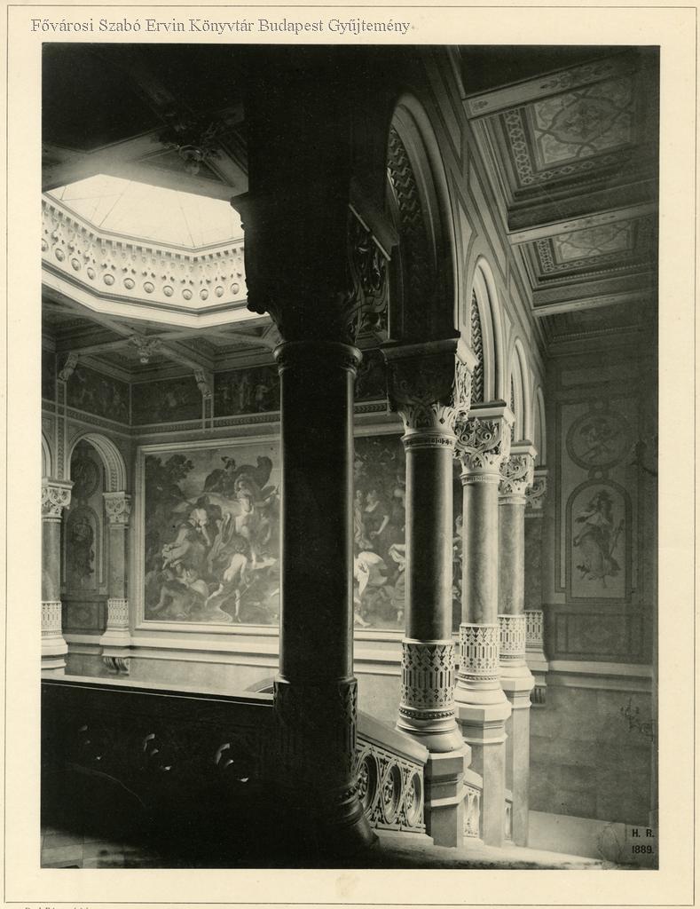 Szép megvilágításban a főlépcső oszlopsora, háttérben Than Mór freskói