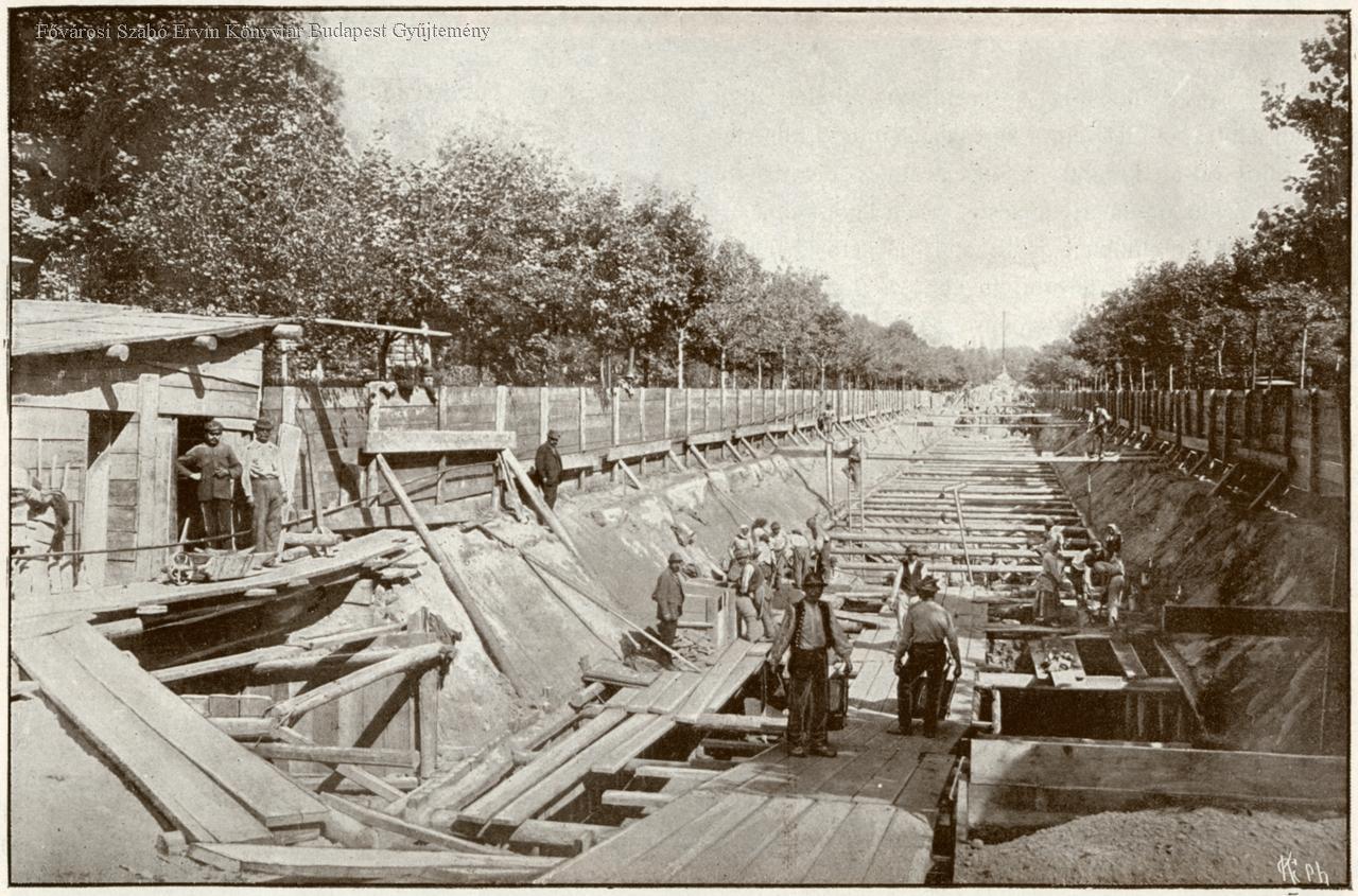 Építési hely az Andrássy-úton az Epreskert-utcza és Aréna-út között, a szádfalak befejezésével, 1894. szept. 19-én Baustelle in der Andrássy Strasse zwischen Epreskertgasse und Arenastrasse nach der Fertigstellung dee Spundwände /
