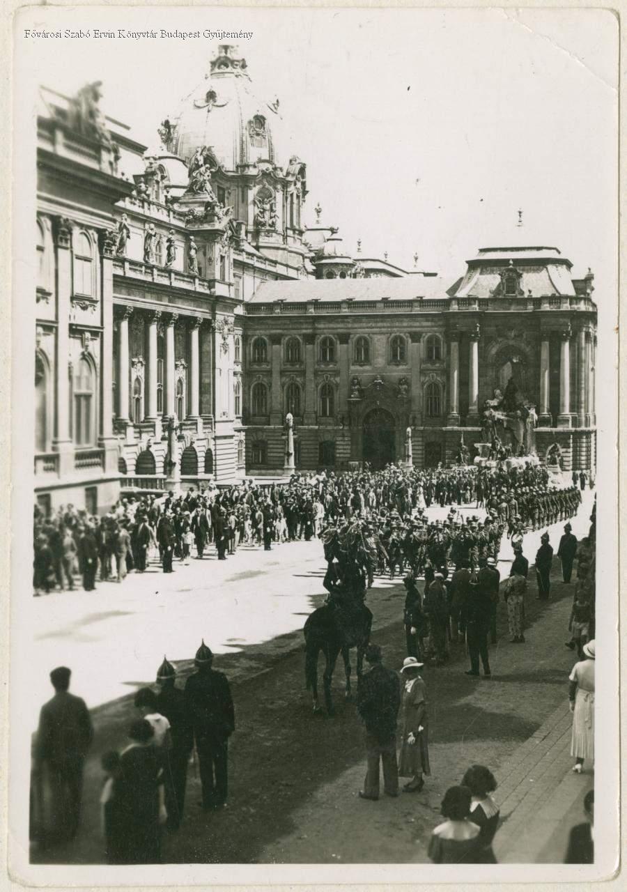 [A Szent Jobb körmenet, díszszázad a Mátyás-kút előtt.]