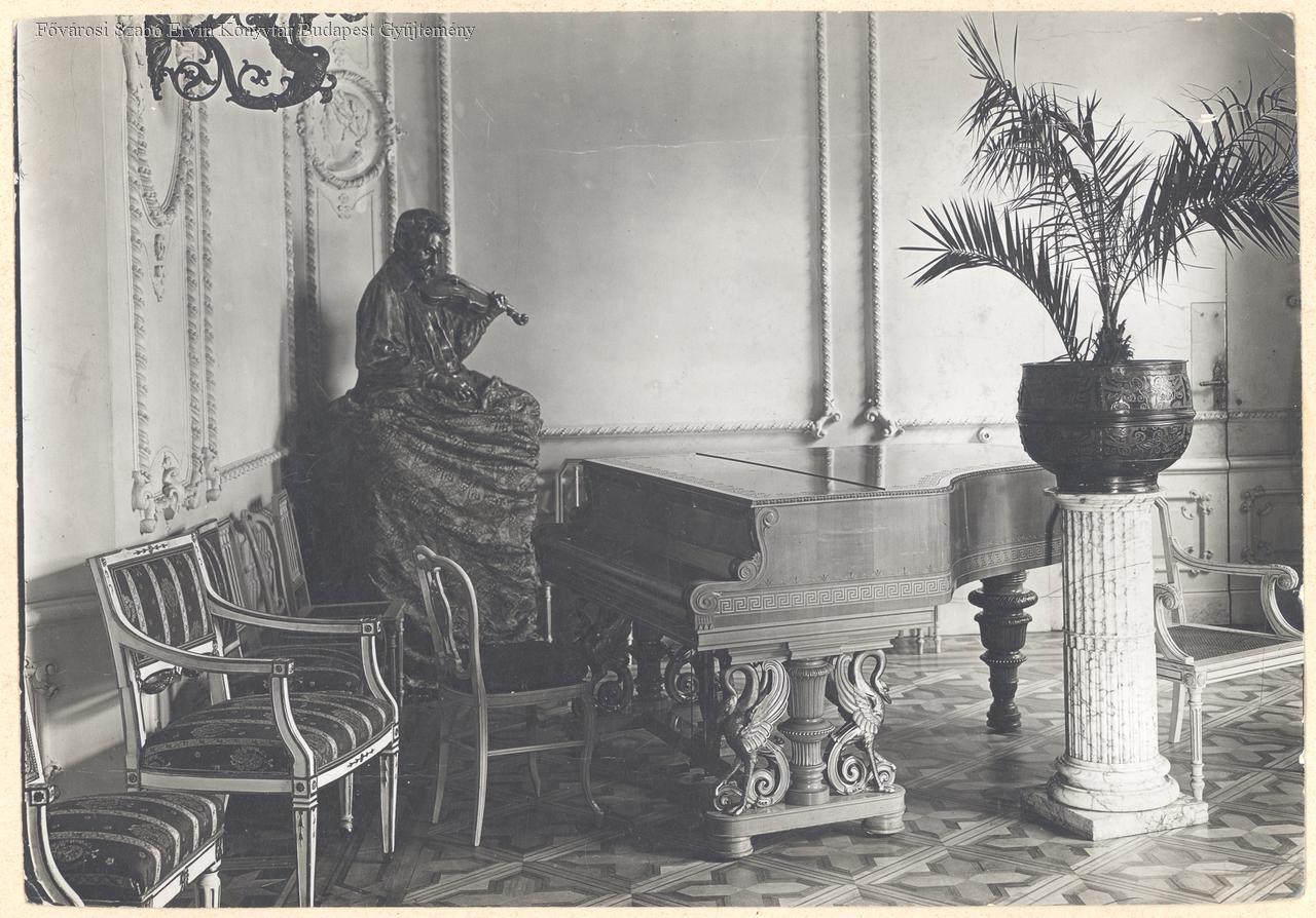 szobor, zongora, bútor, hangversenyterem, épületkép, belső felvétel, 1920-as évek