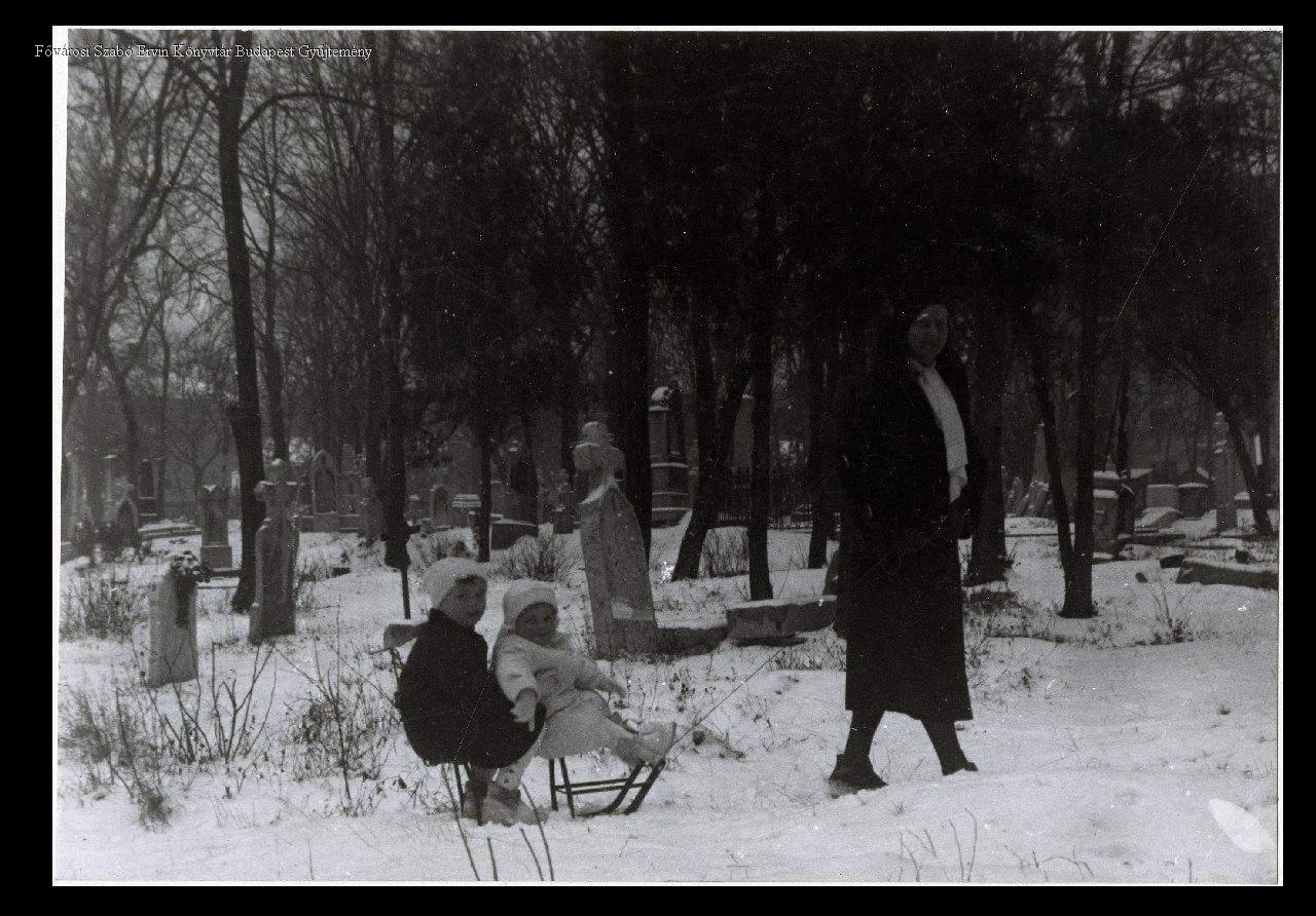 temető, sírkő, tél, szánkó, család, nő, kisgyermek, 1933