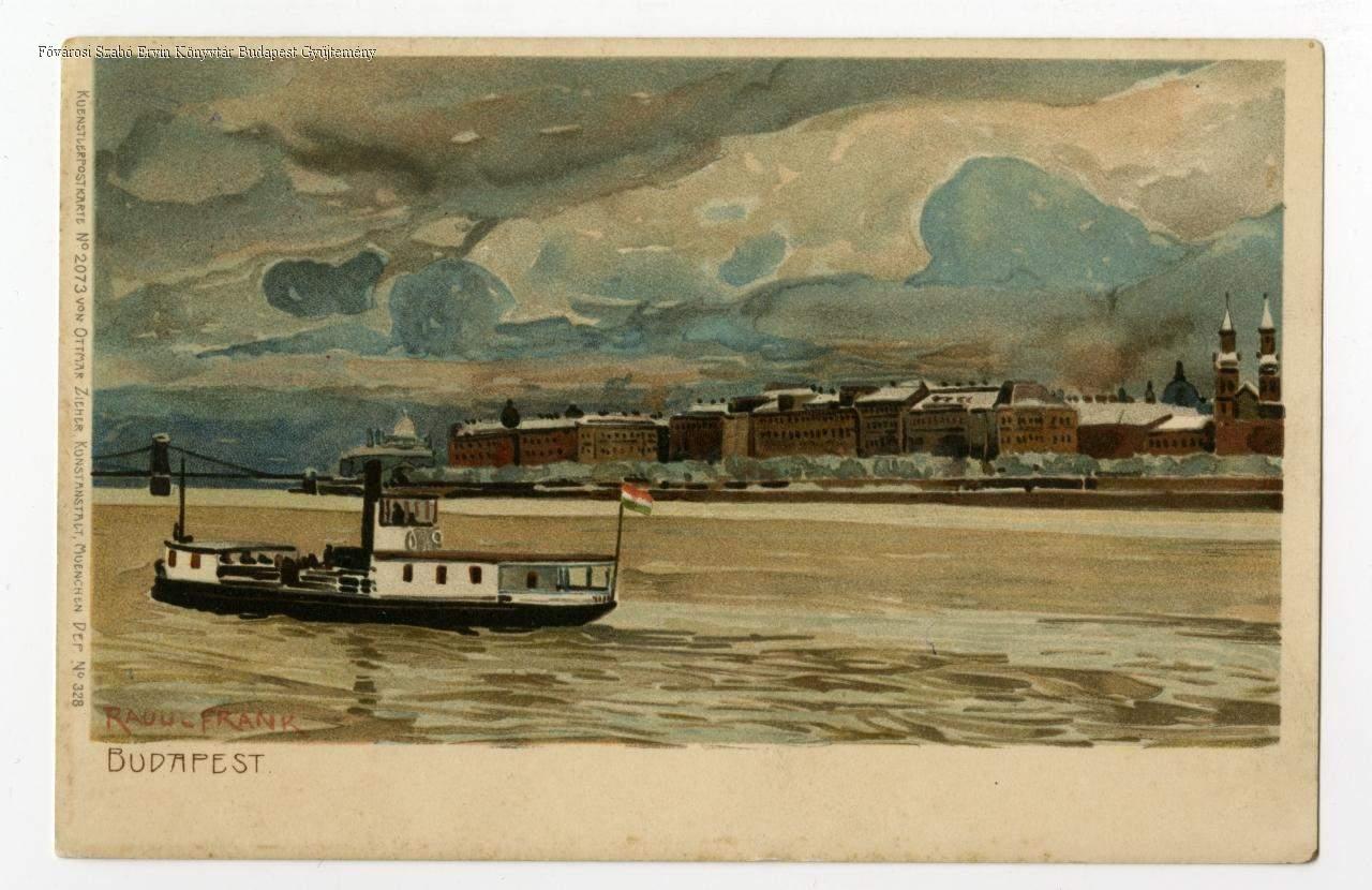 országház, templom, bazilika, katolikus egyház, gőzhajó, rakpart, híd, akvarell, képes levelezőlap, külső felvétel, látkép, 1890-es évek