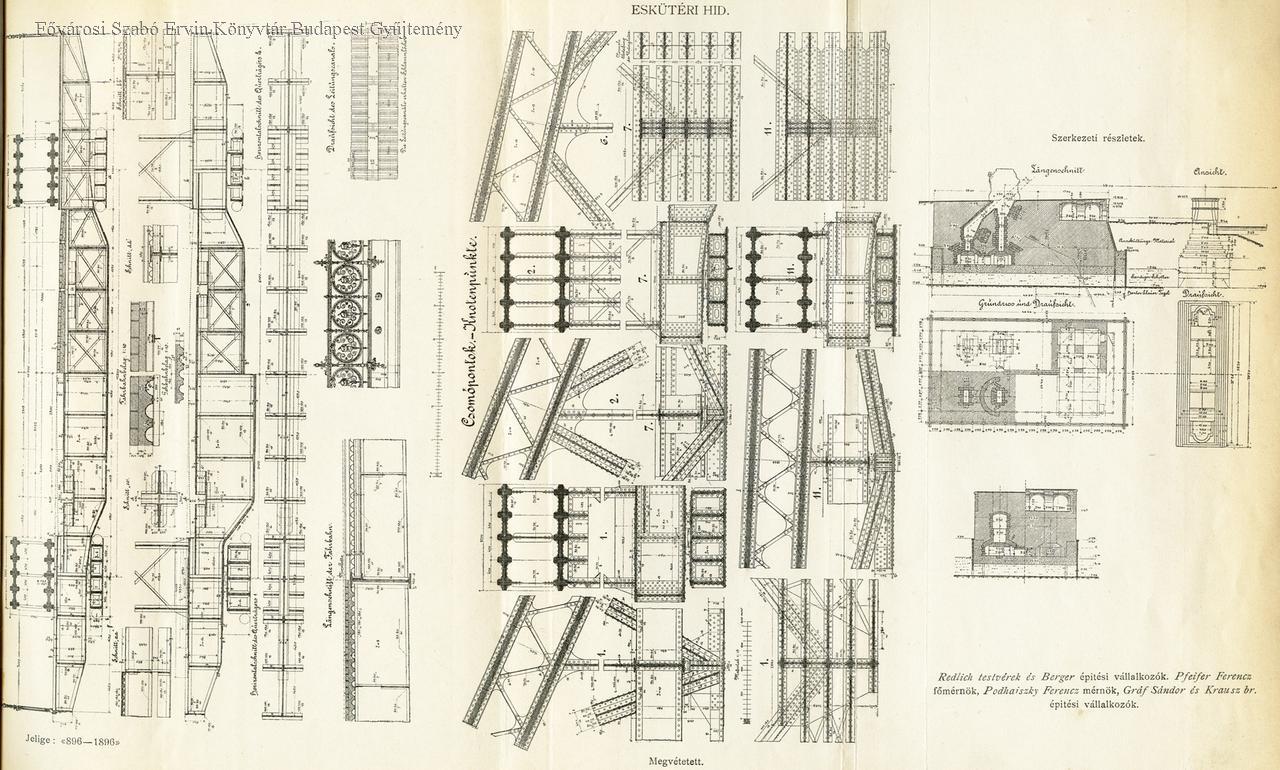 Eskütéri híd Jelige: "896-1896" Redlich testvérek és Berger építési vállalkozók, Pfeifer Ferencz főmérnök, Podhojszky Ferencz mérnök, Gráf Sándor és Krausz br, műépítészek Bécs