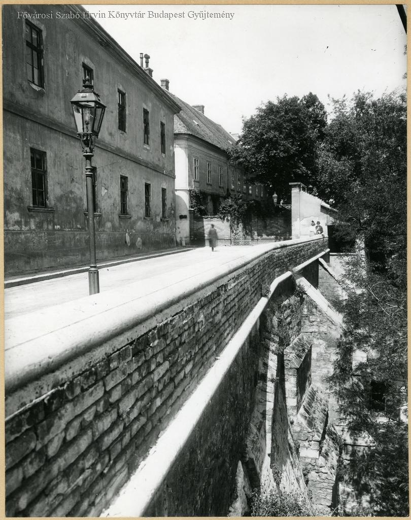 A Várhegy K-i várfala az Ibolya-lépcsőig; balról a mai Hilton Szálló helyén lévő, majd a sétányt lezáró Pejacsevics palota hátsó homlokzata /jelenleg az Országos Műemlékvédelmi Hivatal székháza/