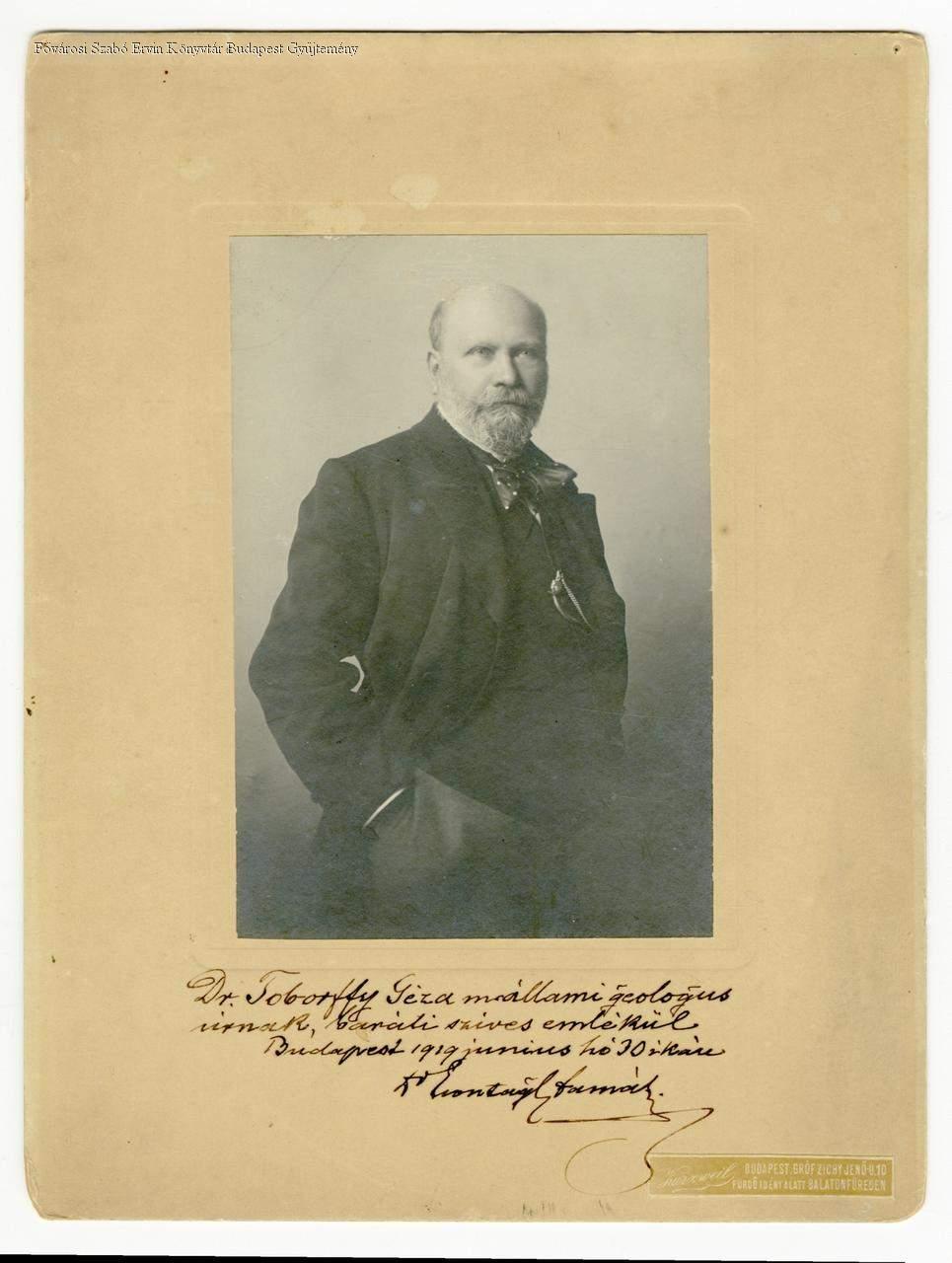 Kézírással ajánlás: Dr. Toborffy Géza mállami [!] geológus úrnak, baráti szíves emlékül / Budapest 1919 június hó 30 ikán / Dr Szontagh Tamás