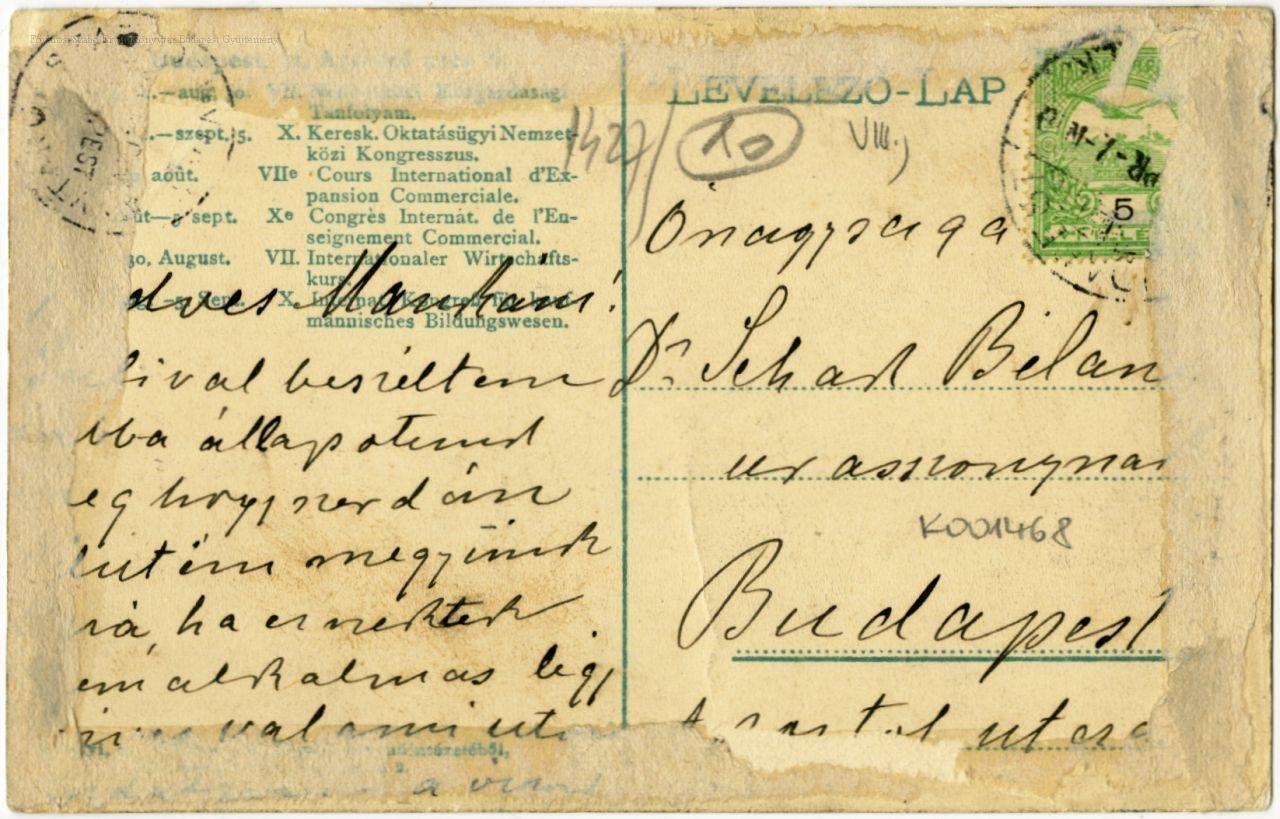 A hátoldalon a II. kerületi Apostol utca 6.-ban, 1913 augusztusában tartott kereskedelmi témájú rendezvények menetrendje