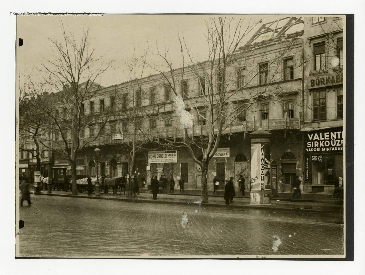 épületbontás, lakóépület, üzlet, kőfaragóipar, hirdetés, hirdetőoszlop, ember, lovas kocsi, utcakép, 1937
