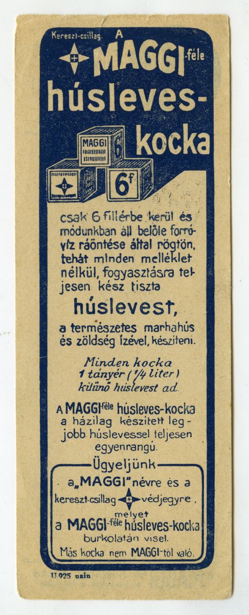 Ügyeljünk a "MAGGI" névre és a kereszt-csillag védjegyre melyet a Maggi-féle húsleves-kocka burkolatán visel. Más kocka nem MAGGI-tól való.