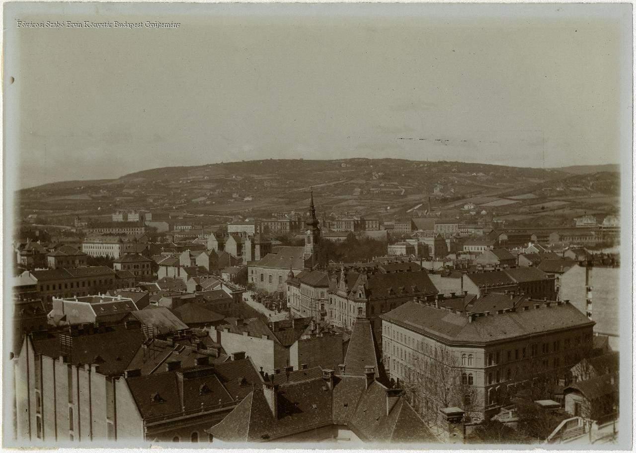 A távolban a Kis-Sváb-hegy, Orbán-hegy, Sváb-hegy. Középen a krisztinavárosi templom, illetve az Alagút utca, Kriszina tér, Mészáros utca, Roham utca Attila út, jobbra a Délivasút és a Karátsonyi-palota