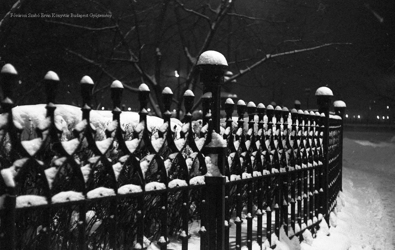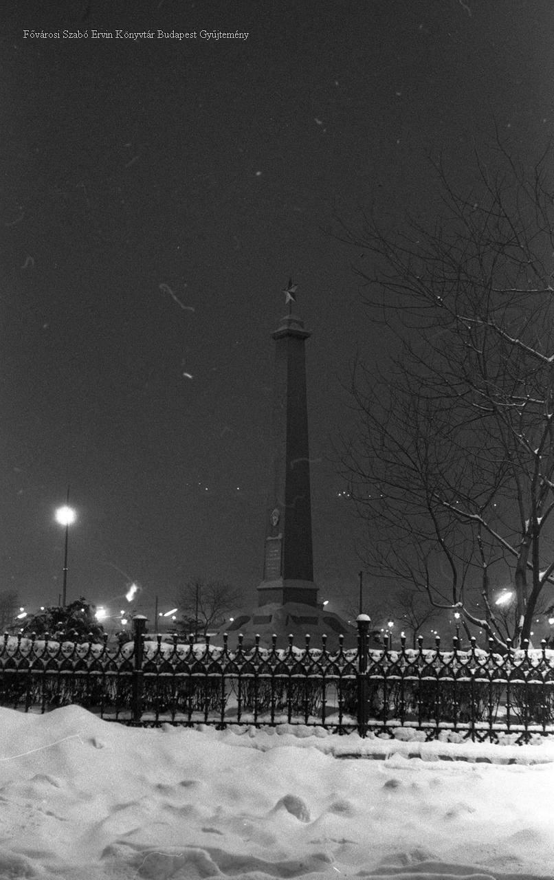 külső felvétel, emlékmű, utcakép, este, hó, tél, közvilágítás, park, kerítés, 1960-as évek