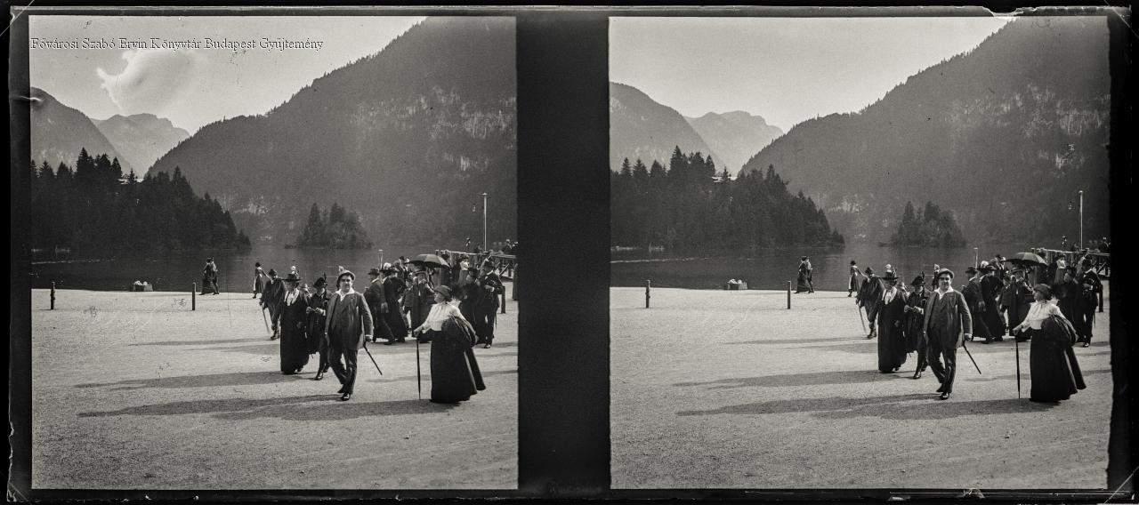 hegyvidék, hegy, tó, növényzet, fenyő, üdülőhely, ember, férfi, nő, viselet, 1900-as évek