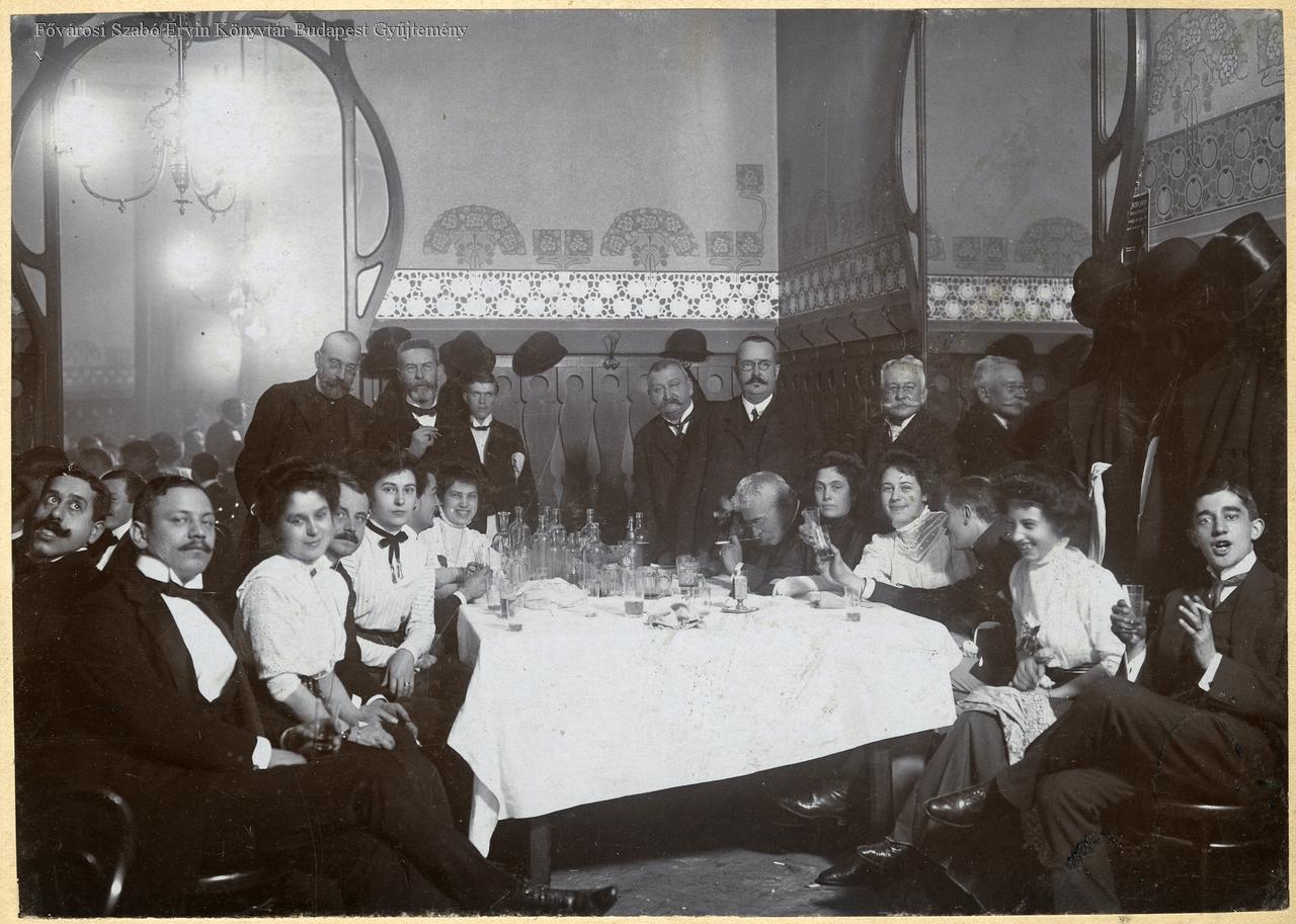 középosztály, vacsora, szórakozás, társasági élet, díszítés, szecesszió, tükör, nevetés, csoportkép, belső felvétel, 1909