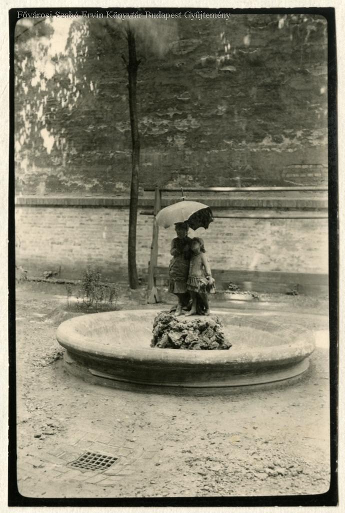 lakóépület, udvar, díszkút, szökőkút, szobor, leánygyermek, esernyő, 1930-as évek