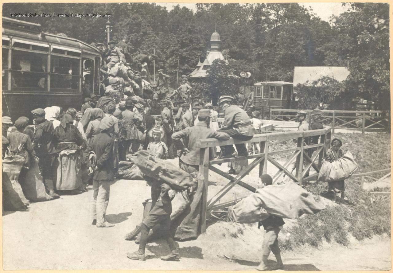 néptömeg, Tanácsköztársaság, szegénység, tüzelő, katona, gyermek, zsák, villamos kocsi, villamos megállóhely, erdő, sajtófotó, 1919