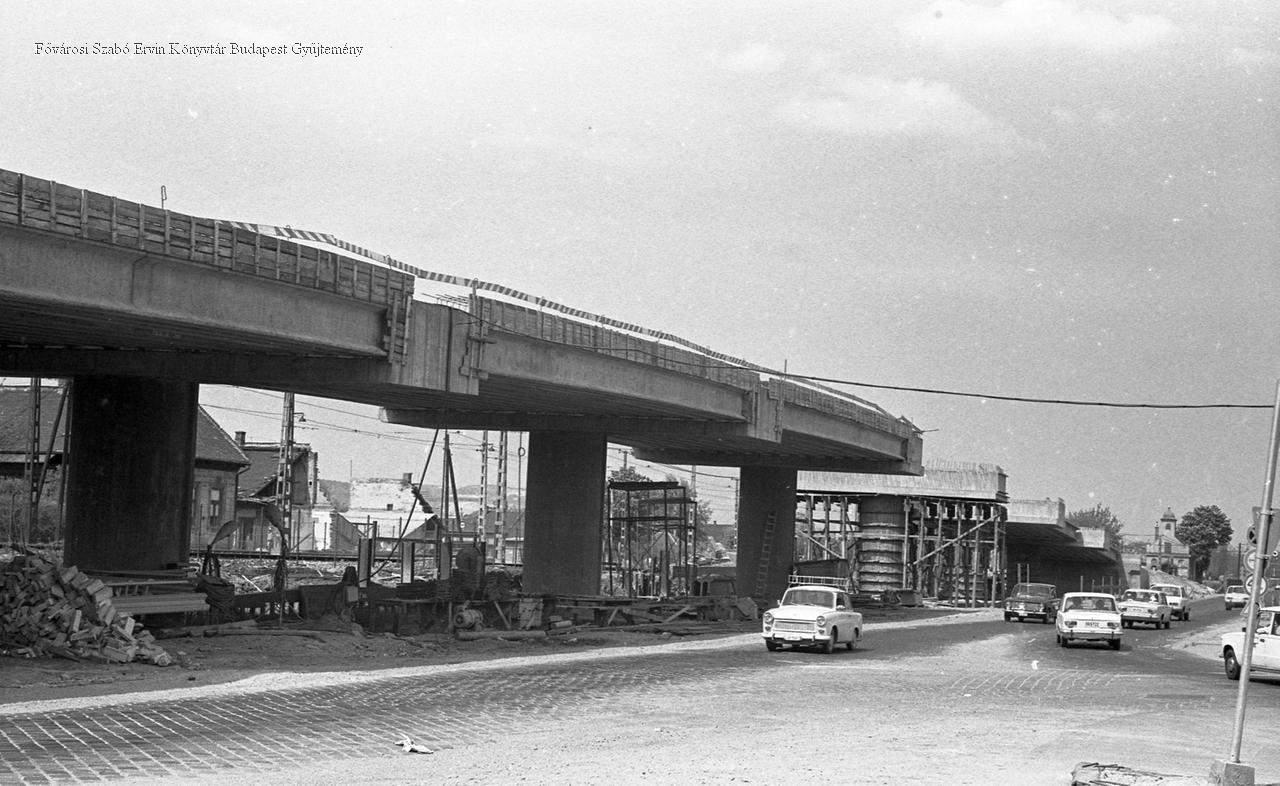 külső felvétel, felüljáró, építés, ember, személygépkocsi, motorkerékpár, 1970-es évek