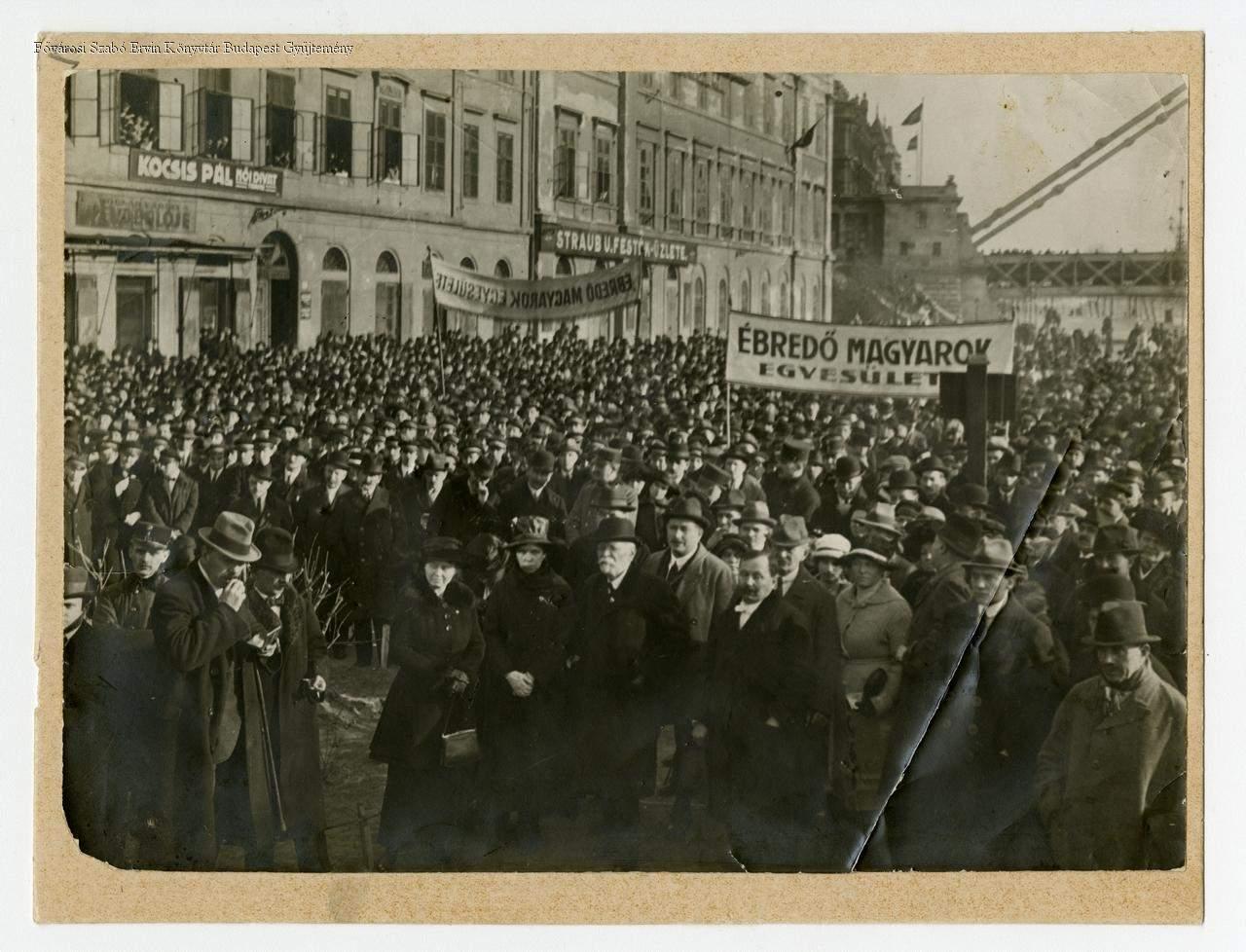 tüntetés, felirat, néptömeg, trianoni békeszerződés, revizionizmus, irredentizmus, területi visszacsatolás, eseménykép, sajtófotó, Horthy-korszak, 1920