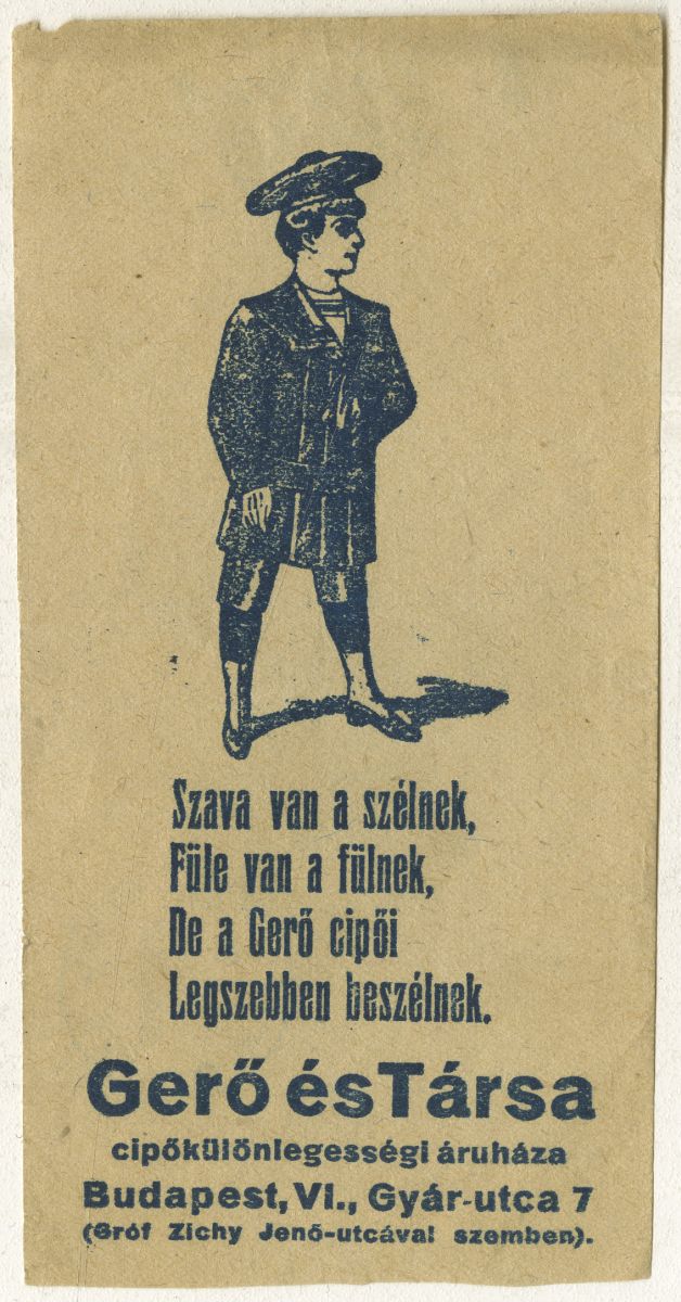 Kinek Gerő-cipő a lábán, az a legény a talpán. Szava van a szélnek, füle van a fülnek, de a Gerő cipői a legszebben beszélnek. (...)