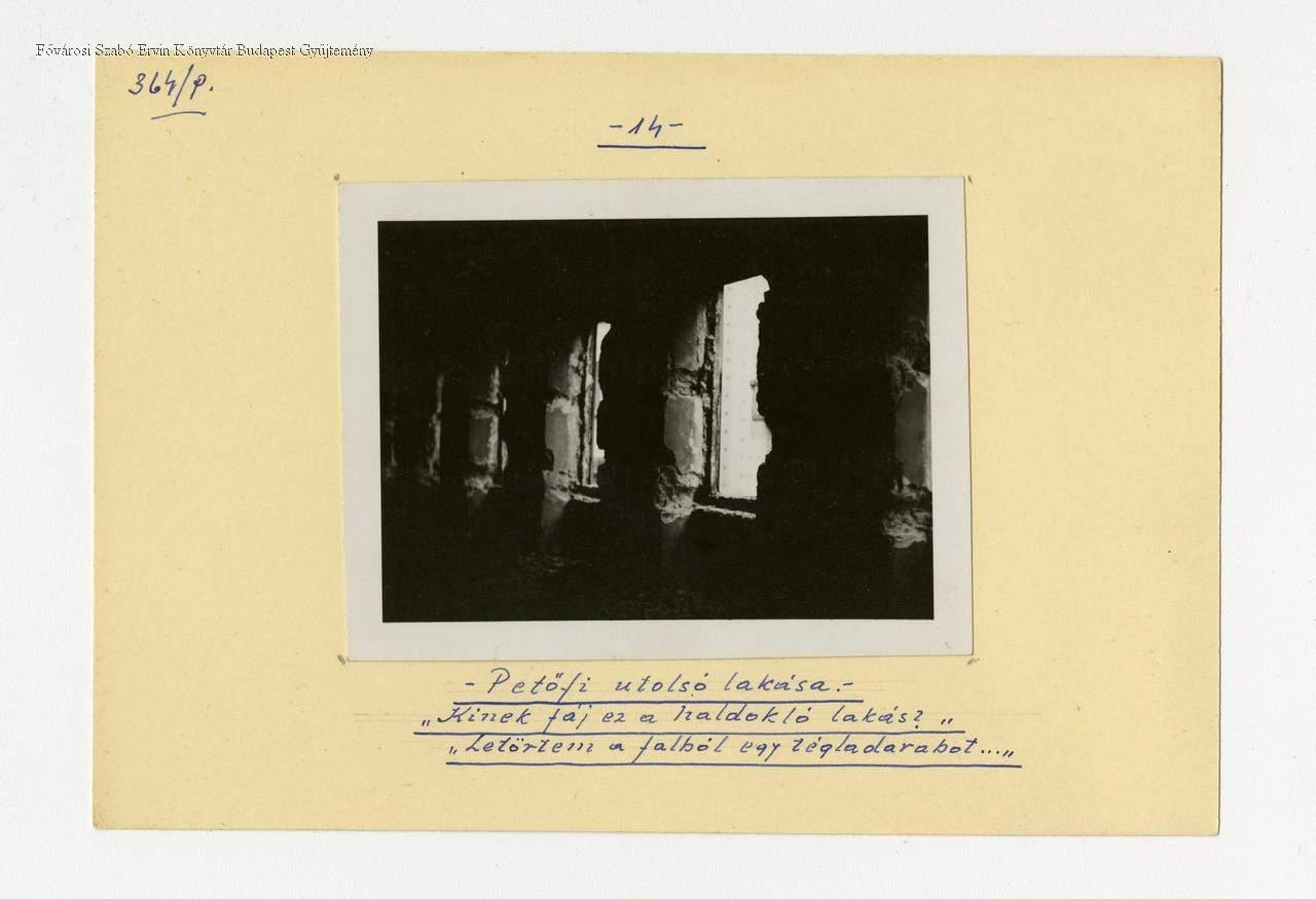 Kartonokra ragasztott, kisméretű fénykép-sorozat egyik darabja. Az amatőrfotók Petőfi utolsó pesti lakhelyét, a Rákóczi és a Síp utca sarkán egykor állott Marczibányi-házat mutattatják. 1936-ban készültek, többségük néhány héttel a ház lebontása előtt, néhány pedig a munkálatok megindulása után. Vélhetően Vasberényi Géza (1894-1981) könyvtáros, helytörténész tulajdona volt. (Esetleg ő készítette a felvételeket is?). Vasberényi Géza a húszas évektől kezdve gyűjtötte a költő emlékéhez kapcsolódó tárgyakat, dokumentumokat. Petőfi-relikviagyűjteményét haláláig dunavecsei házában őrizte, mely maga is emlékhely volt: az ifjú poéta 1844-ben ennek egyik szobájában vett kvártélyt magának. A Petőfi-kutató hagyatékát az örökösök eladták, szétszóródott. Egy részét az Ecseriről mentette meg egy magángyűjtő, 2012-ben pedig a Petőfi Irodalmi Múzeum is vásárolt néhány darabot az értékes tárgyakból.