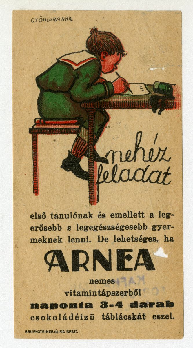 A hirdetés szövege: Nehéz feladat tanulónak és emellett a legerősebb gyermeknek lenni. De lehetséges, ha Arnea nemes vitamintápszerből naponta 3-4 darab csokoládéízű táblácskát eszel.