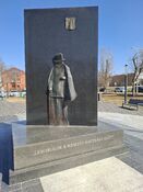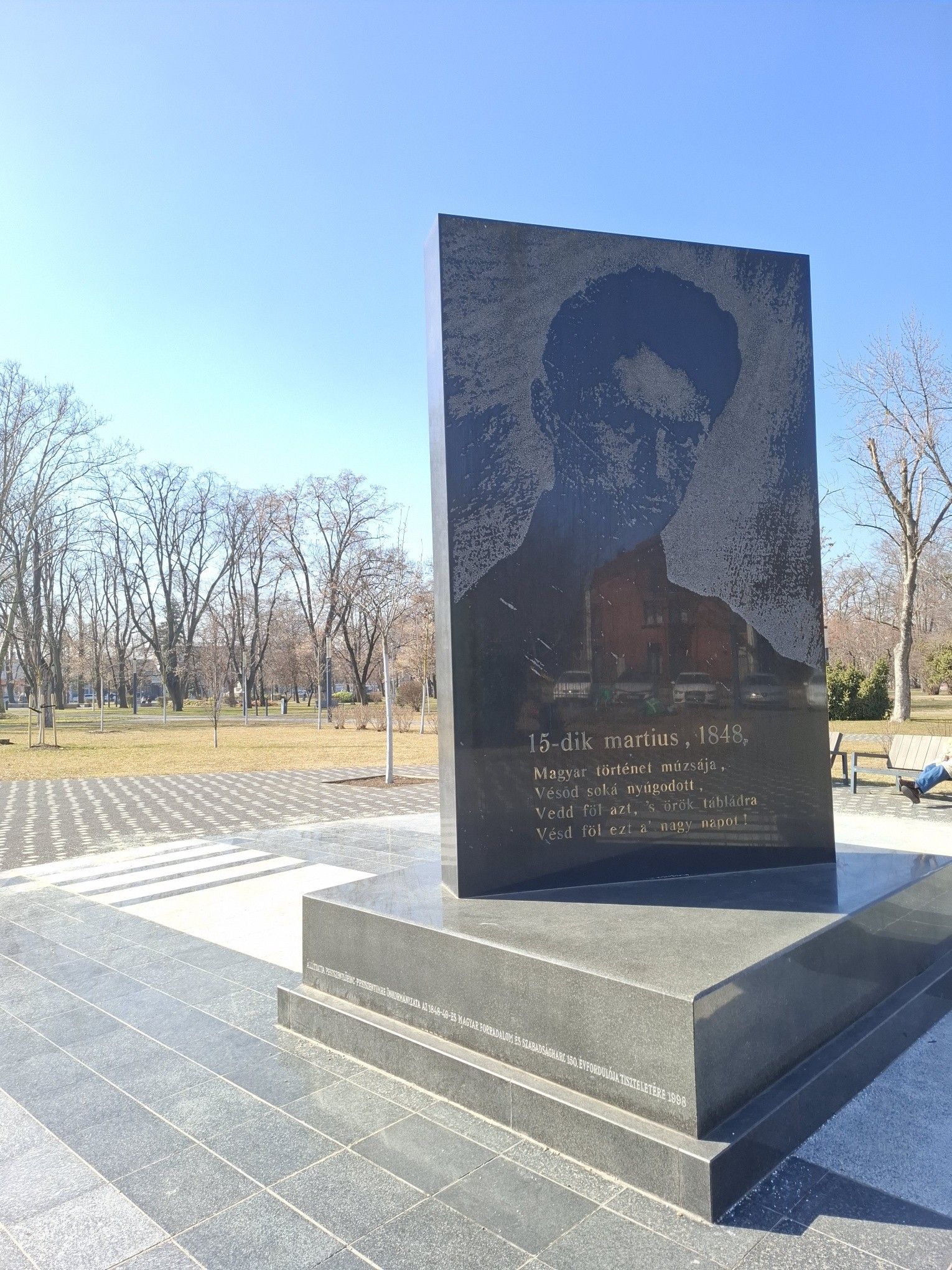 Az álló fekete gránitkő egyik oldalán Petőfi Sándor arcképe és versrészlete látható: