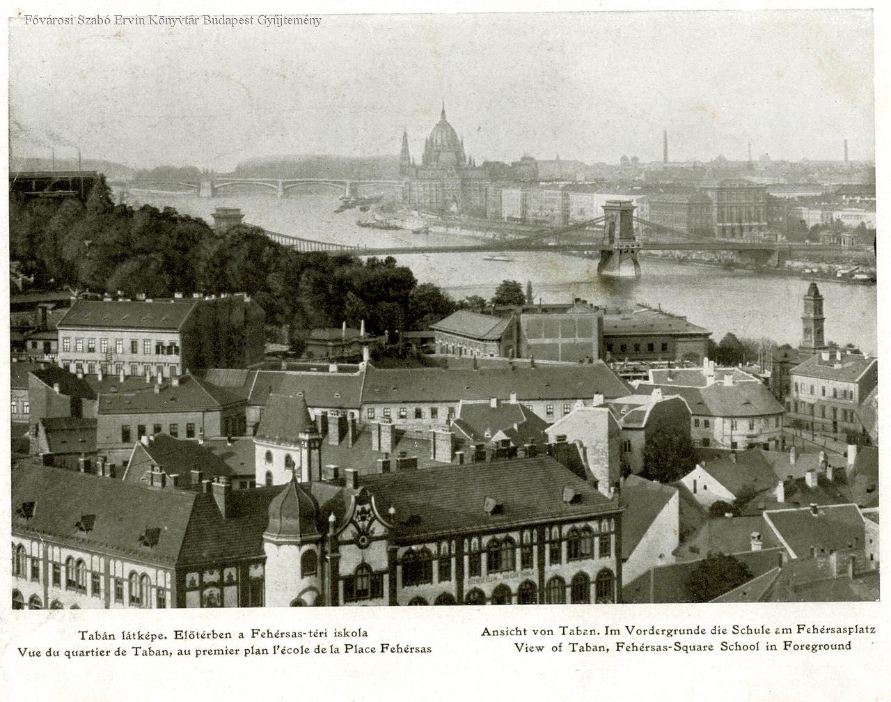 Tabán látképe, előtérben a Fehérsas téri iskola Ansicht von Taban, im Vordergrunde die Schule am Fehérsasplatz = Vue du quartier du taban, au premier l'ecole de la Place Fehérsas = View of Taban, Fehérsas Squere School im foreground