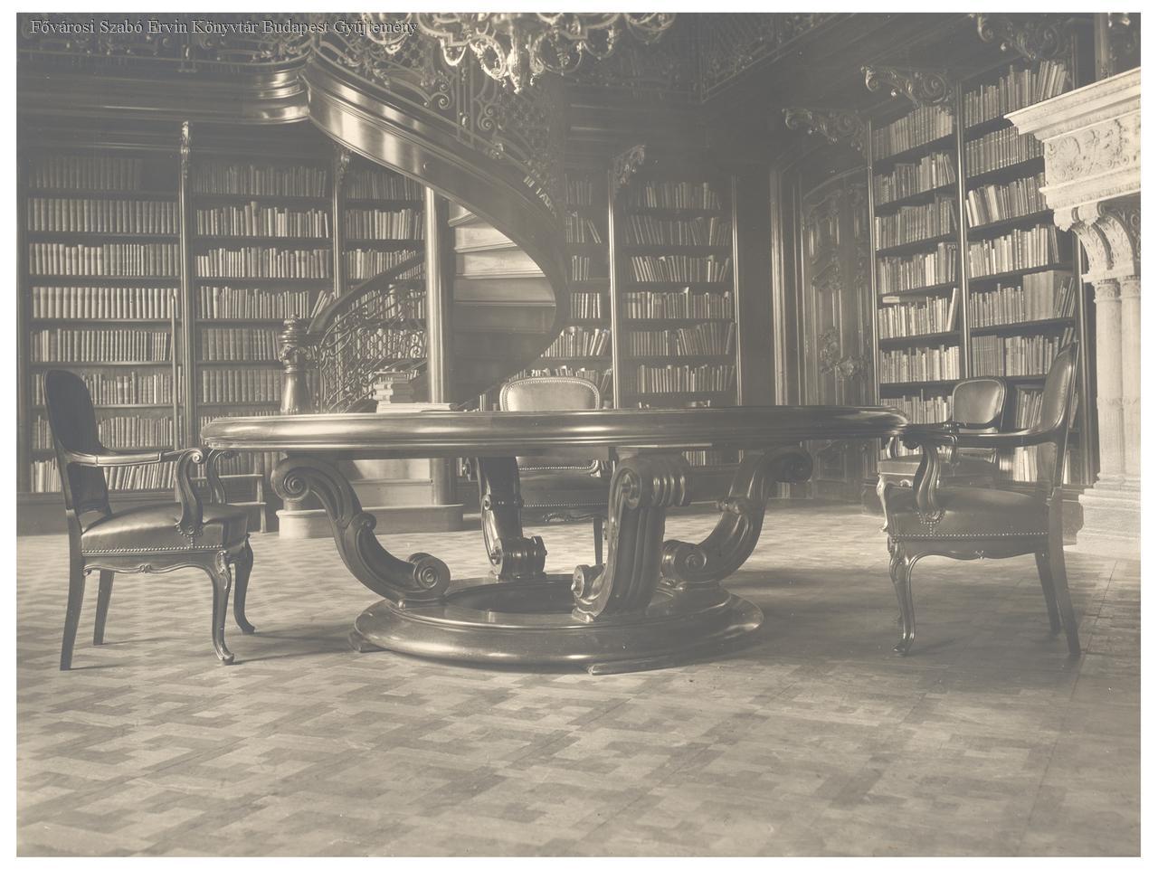 könyvtár, palota, belső felvétel, bútor, lépcső, könyvespolc, kandalló, különgyűjtemény, lámpa, parketta, 1931