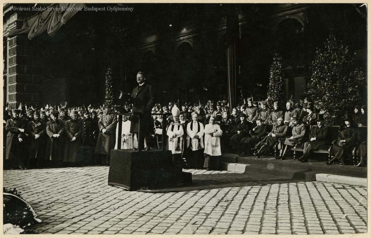 [Olaszországból hazahozott hősi halottak gyászünnepe a Keleti pályaudvar előtt] [Sipőcz Jenő polgármester beszél]