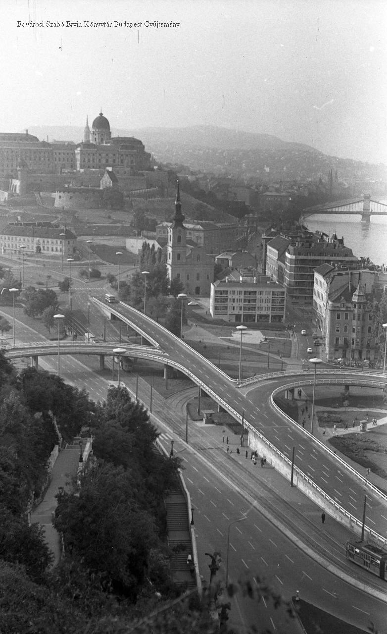 külső felvétel, látkép, híd, templom, személygépkocsi, közúti villamos, 1960-as évek