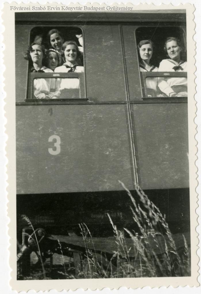 jelenetkép, nő, középiskolás, tanuló, ruházat, vonat, kirándulás, nyár, amatőr fénykép, 1937