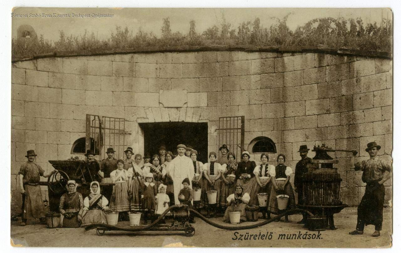 képes levelezőlap, külső felvétel, csoportkép, szüretelés, szőlő, sajtológép, szőlőfeldolgozó gép, borospince, népviselet, 1910-es évek