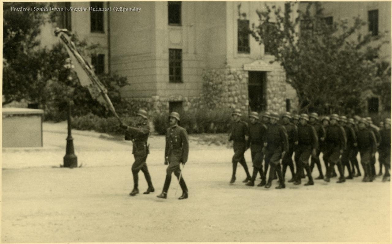 laktanya, haderő, katonai alakzat, menetoszlop, egyenruha, udvar, fa, zászló, külső felvétel, 1940-es évek