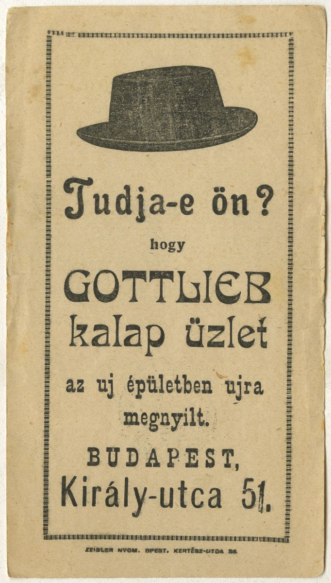 Tudja-e ön? hogy a Gottlieb kalap üzlet az uj épületben ujra megnyílt.