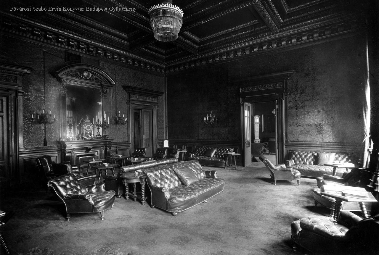 klub, belsőépítészet, asztal, ülőbútor, tükör, kandalló, óra, épületkép, belső felvétel, 1891 körül