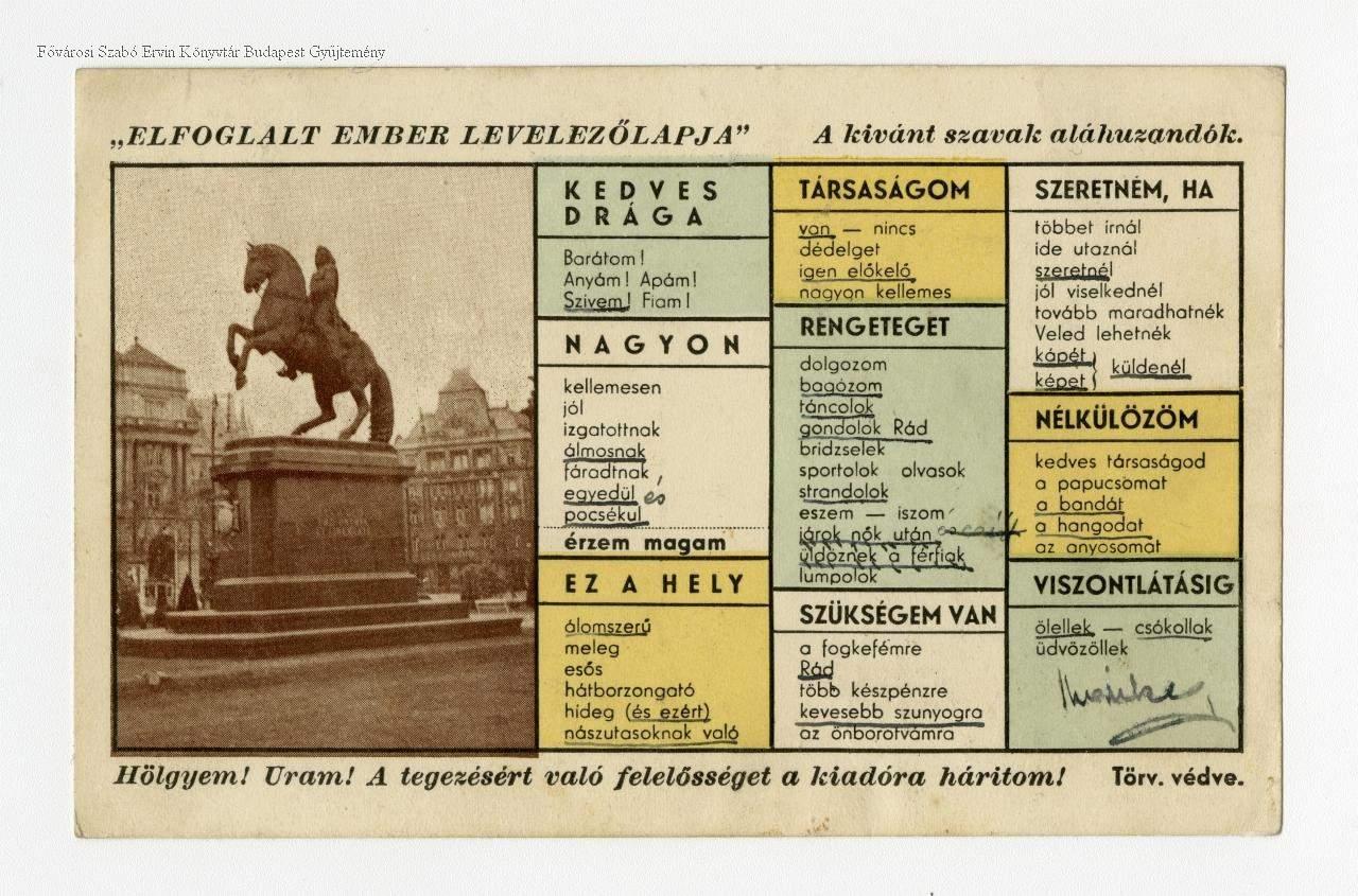 "Elfoglalt ember levelezőlapja", a kivánt szavak aláhuzandók Budapest II. Rákóczi Ferenc szobor