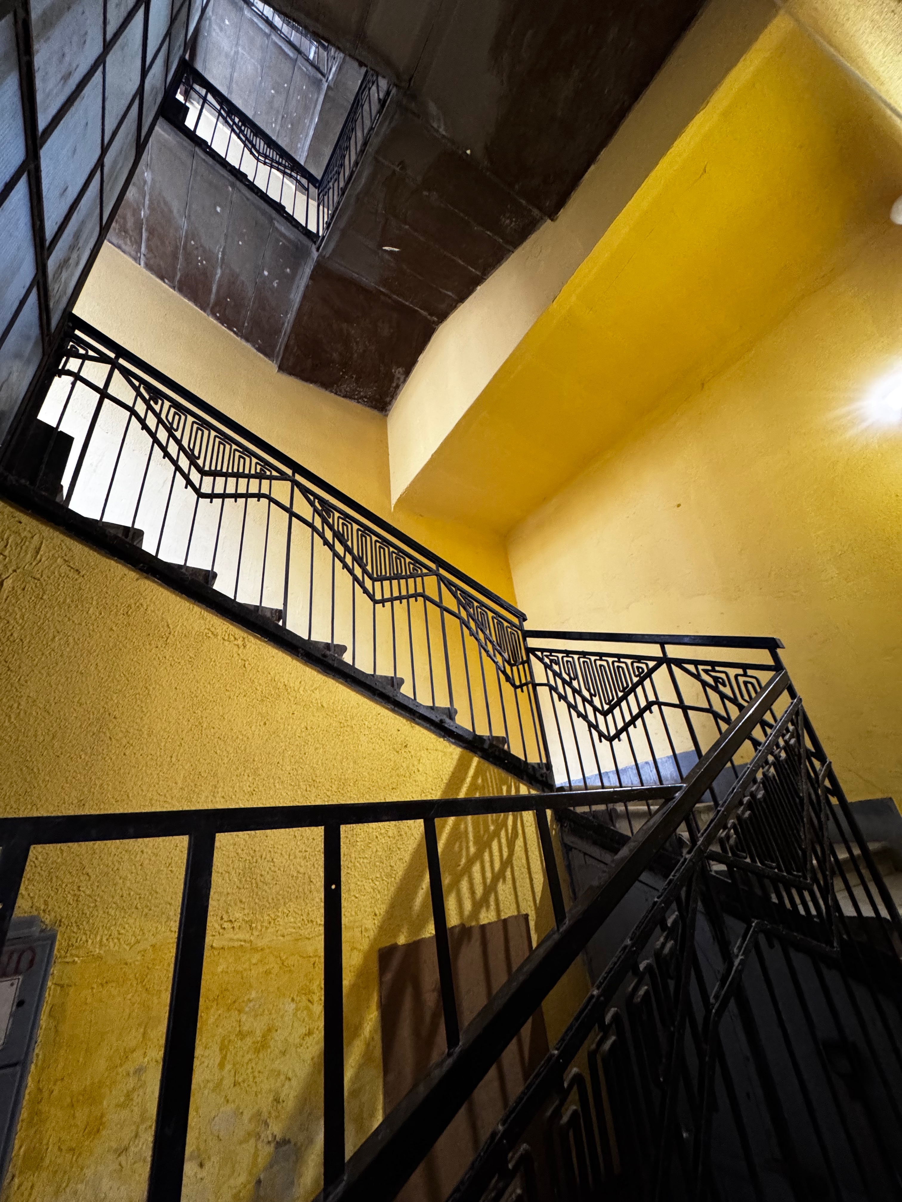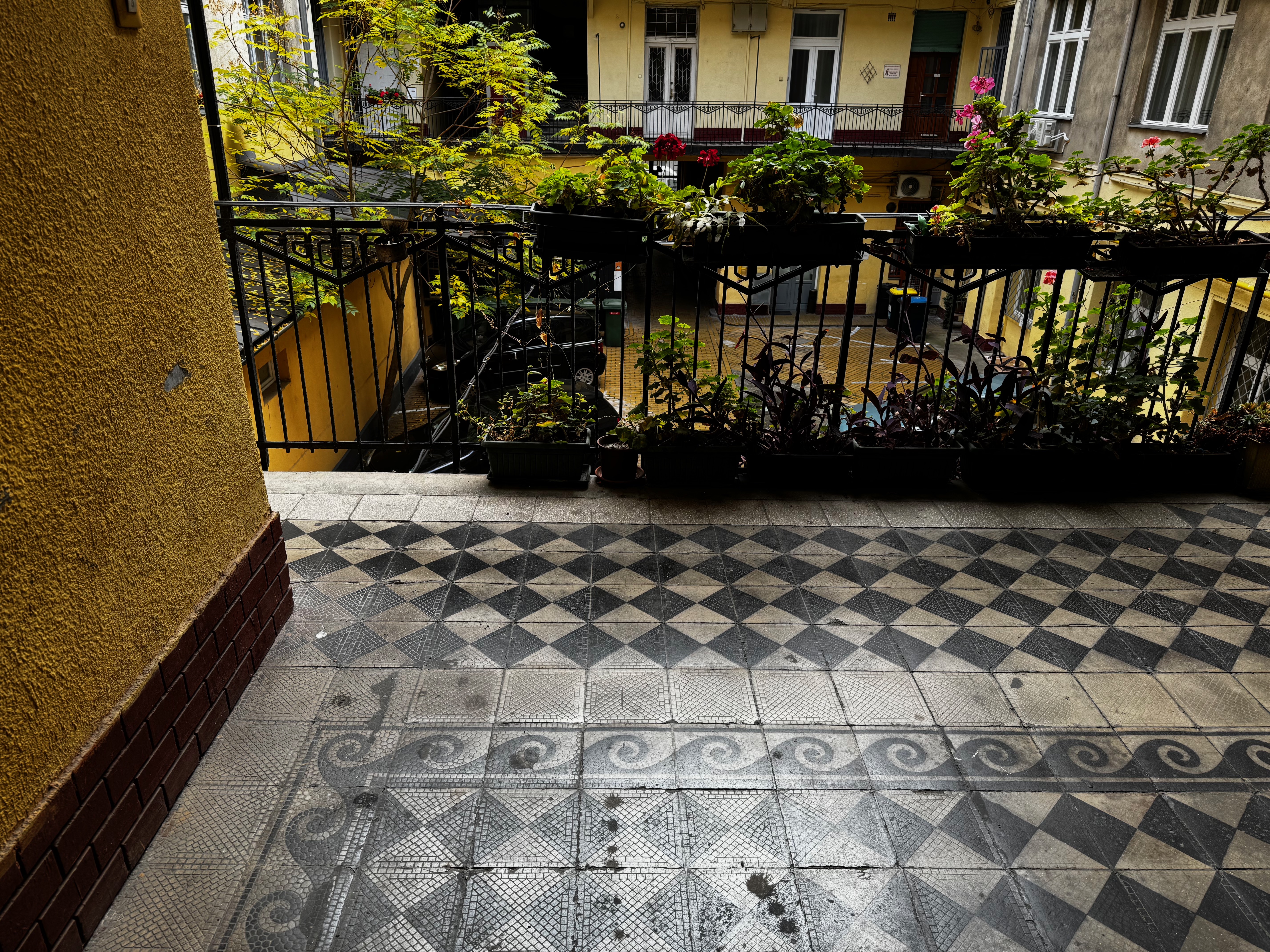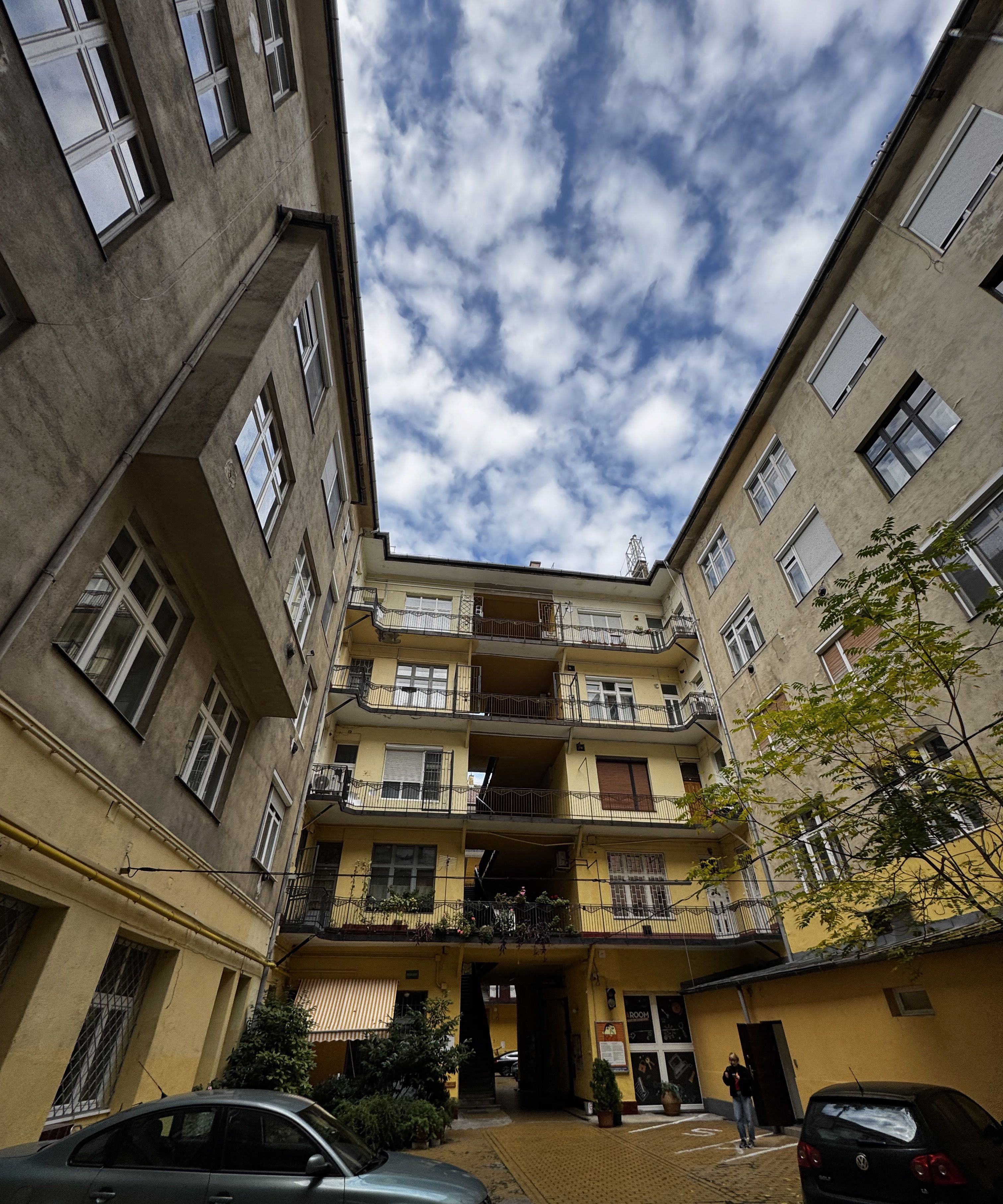 A belső udvar két részre tagolódik, a függőfolyósókról nyílnak a lakások, amelyeknek ablakuk és ajtajaik az udvarra néznek.