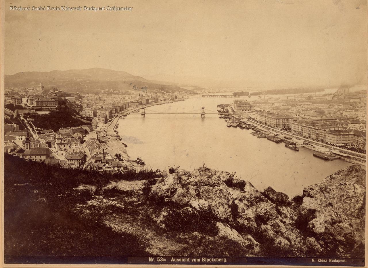 Kilátás északkelet felé az épülő Margit-hídig és a Hármashatár-hegyig. A tabáni katolikus templom és Mátyás templom még átalakítás előtti formában. A Margit híd épül (1876-ban adták át).