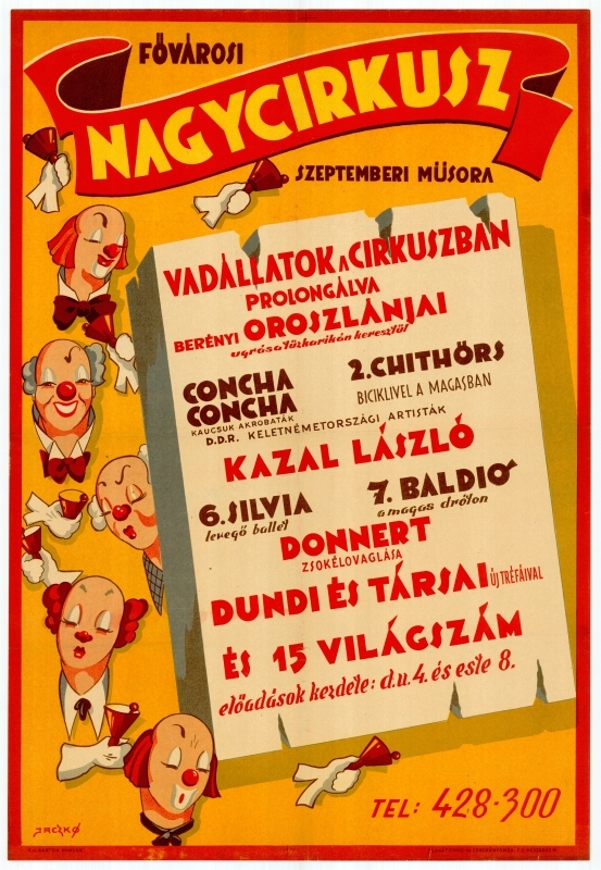A plakát a Budapest Nagycirkusz 1951 szeptemberi előadását hirdeti, amely a Városligetben zajlott. Az előadások naponta 16 és 20 órakor kezdődtek. A műsor csúcspontja Berényi oroszlánmutatványa volt, ahol a vadállatok tűzgyűrűkön ugráltak keresztül látványos módon. A programban szerepelt a Chithörs című produkció is, amely kerékpáros mutatványokat mutatott be a levegőben. A kelet-német Concha fivérek gumiakrobatákként léptek fel, bemutatva különleges rugalmasságukat és egyensúlyérzéküket. A humor és szórakoztatás területét Kazal László képviselte, aki mint ismert magyar komikus valószínűleg bohóc produkcióval vagy színpadi jelenléttel szórakoztatta a közönséget. Donner is fellépett, aki lovon végzett mutatványokkal szórakoztatta a nézőket. Egy Silvia nevű művész légi balettel vagy légi gimnasztikával szárnyalt a levegőben, míg Baldio a kötélen egyensúlyozott. A bohóc produkciók sem maradtak el: Dundi és barátai új vicces előadással színesítették a műsort, szórakozást hozva a nézőknek. A plakát szerint 15 további „világprodukció” is gazdagította a programot, amely így nemcsak a gyerekeket, hanem a felnőtt közönséget is lenyűgözte látványos, nemzetközi szintű előadásokkal.