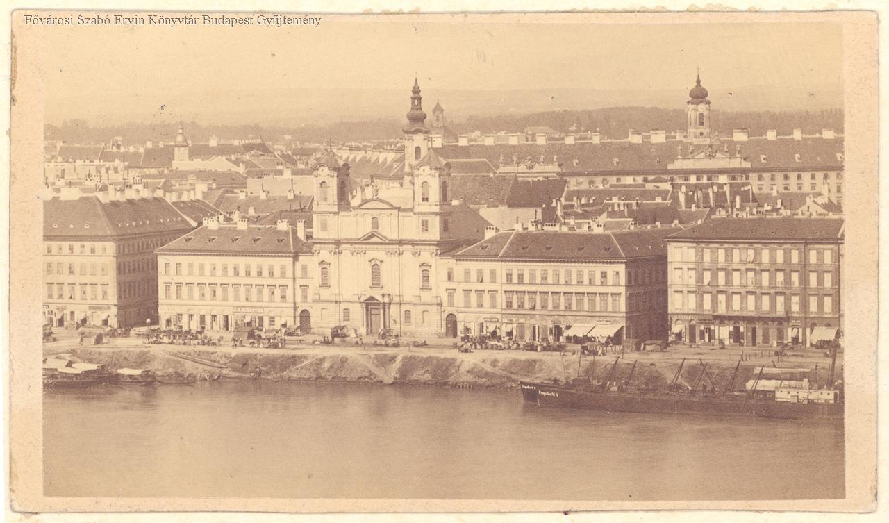 Rakpart kiépítetlen. Háttérben a Károly kaszárnya és a terézvárosi templom tornya. A görög templom átalakítás előtt (1874)