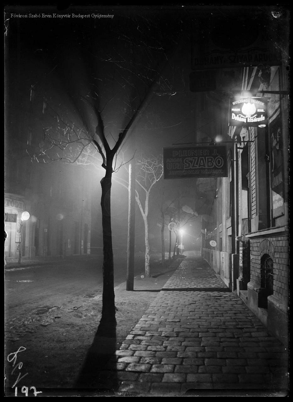 éjjel, cégtábla, fa, fényhatás, utcakép, két világháború közötti időszak, 1930