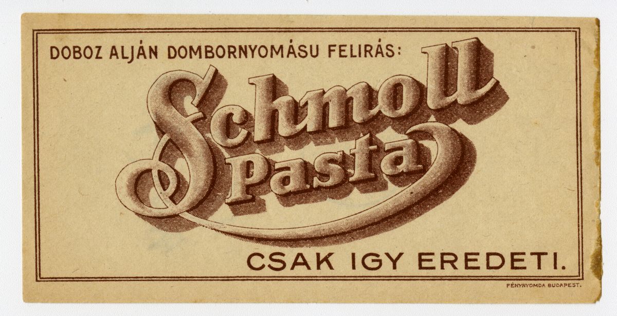 Doboz alján dombornyomású felírás: Schmoll Pasta csak így eredeti.