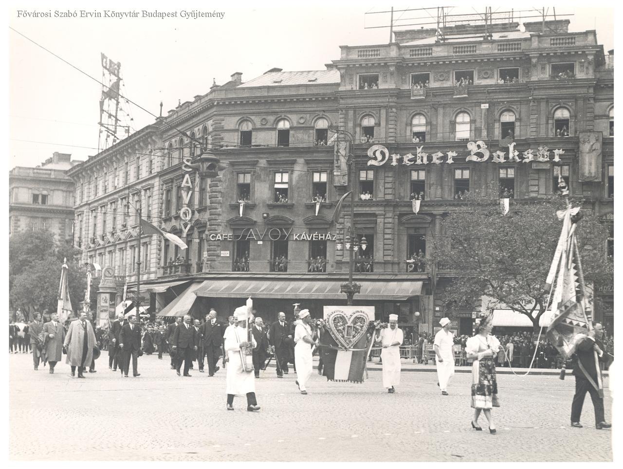 A budapesti cukrászok felvonulása. A Dréher baksör és a Savoy kávéház fényreklámjai.
