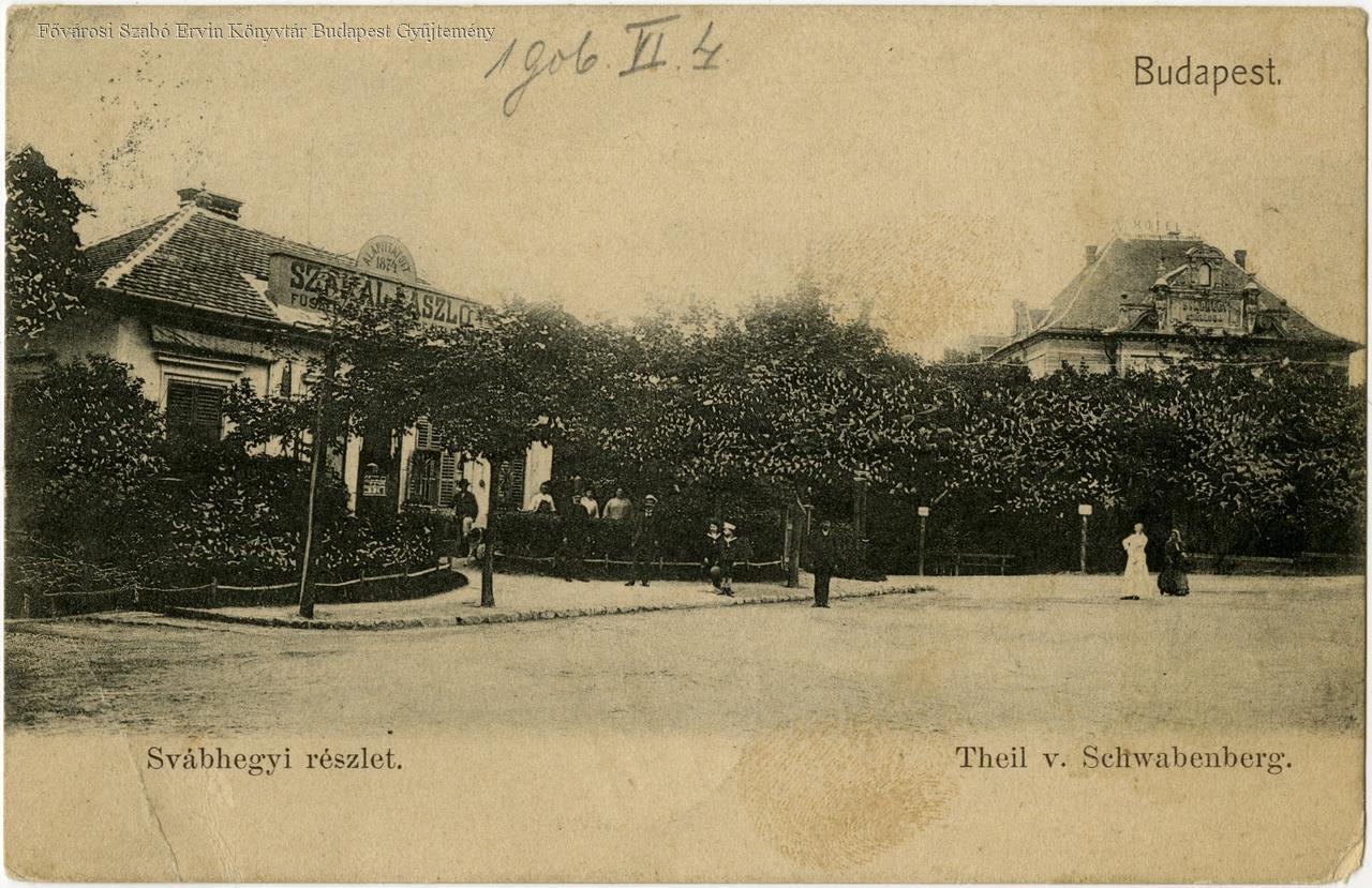 képes levelezőlap, utcakép, szálloda, üzlet, kerítés, 1900-as évek