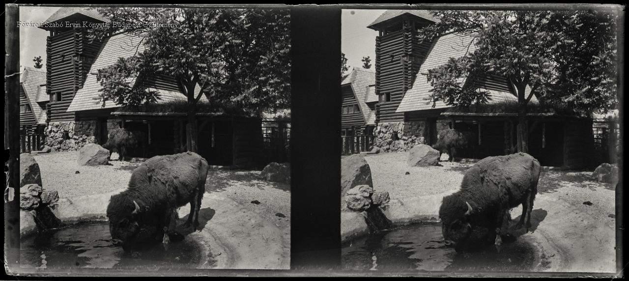 [Állatkert, bölények a bölényház előtt] [Budapest Zoo, bisons in front of the bison house]