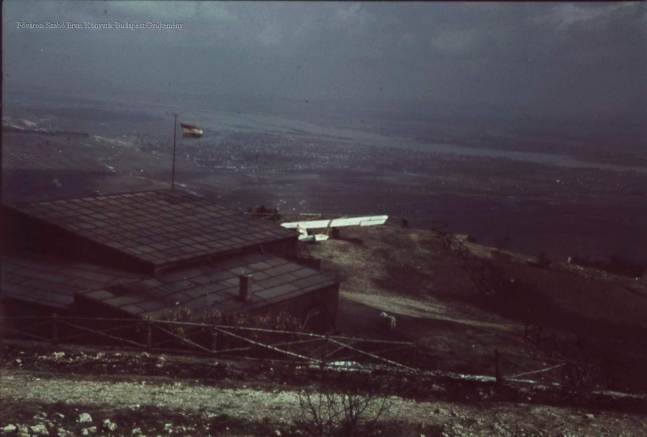 [Kilátás a Hármashatárhegyről a Duna felé, előtérben a repülőtér nagy hangárja]