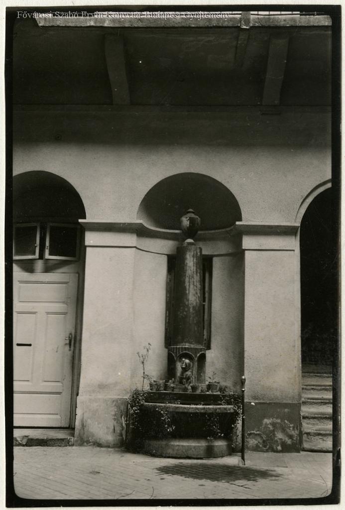 "Négyszögletes zárt udvaron falfülkében vörösmárvány obeliszken vázával díszített falikút." Déry Attila: Belváros, Lipótváros p. 72.