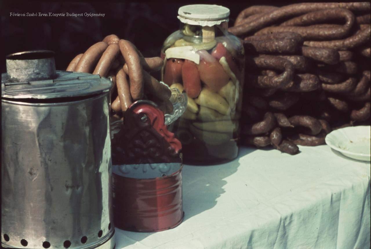 csendélet, élelmiszer, élelmiszer-tárolás, befőtt, savanyúság, kolbász, húsáru, asztal, konyhaedény, 1937-1944