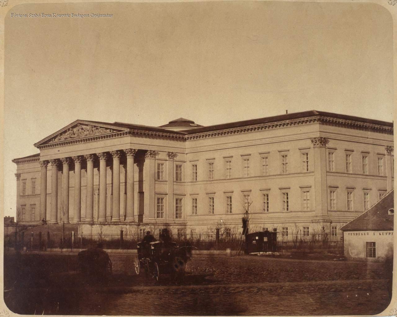 múzeum, klasszicizmus, kert, növényzet, kávéház, fogat, lámpa, útburkolat, épületkép, 1859